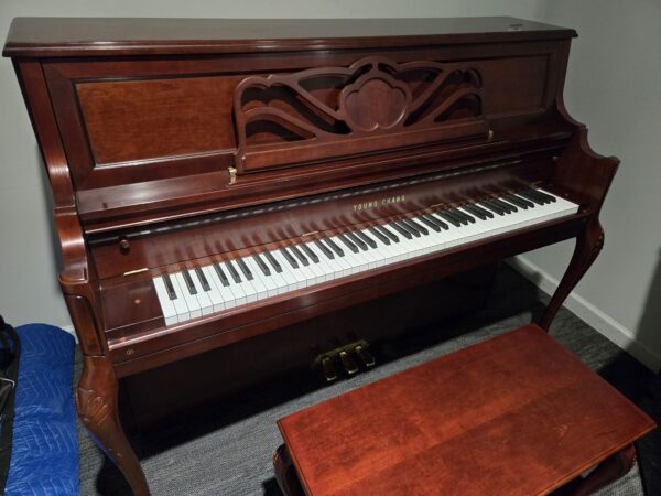 This is a Young Chang console upright, built in South Korea in 1997. The model is F-116 and it is a beautiful, rich cherry finish.